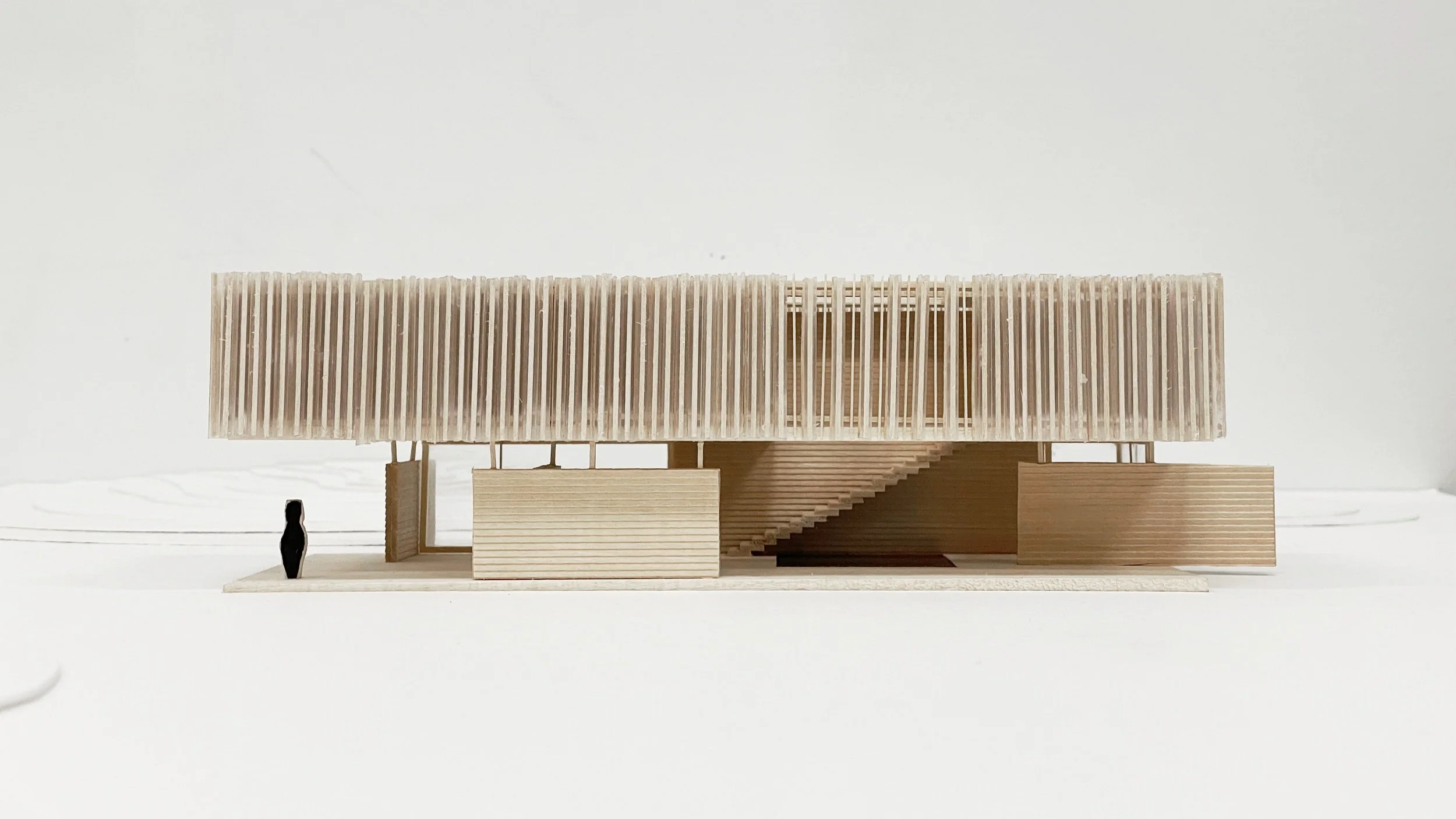 The upper level, which houses the art, employs a delicate and tectonic construction, emphasizing craftsmanship and reverence toward the exhibited pieces. In contrast, the lower level is designed with a stereotomic, monolithic approach, symbolizing the silenced and misunderstood history of Native peoples. Rammed earth walls convey a sense of permanence and weight, their surfaces etched with fragments of indigenous history—subtle, yet deeply embedded.