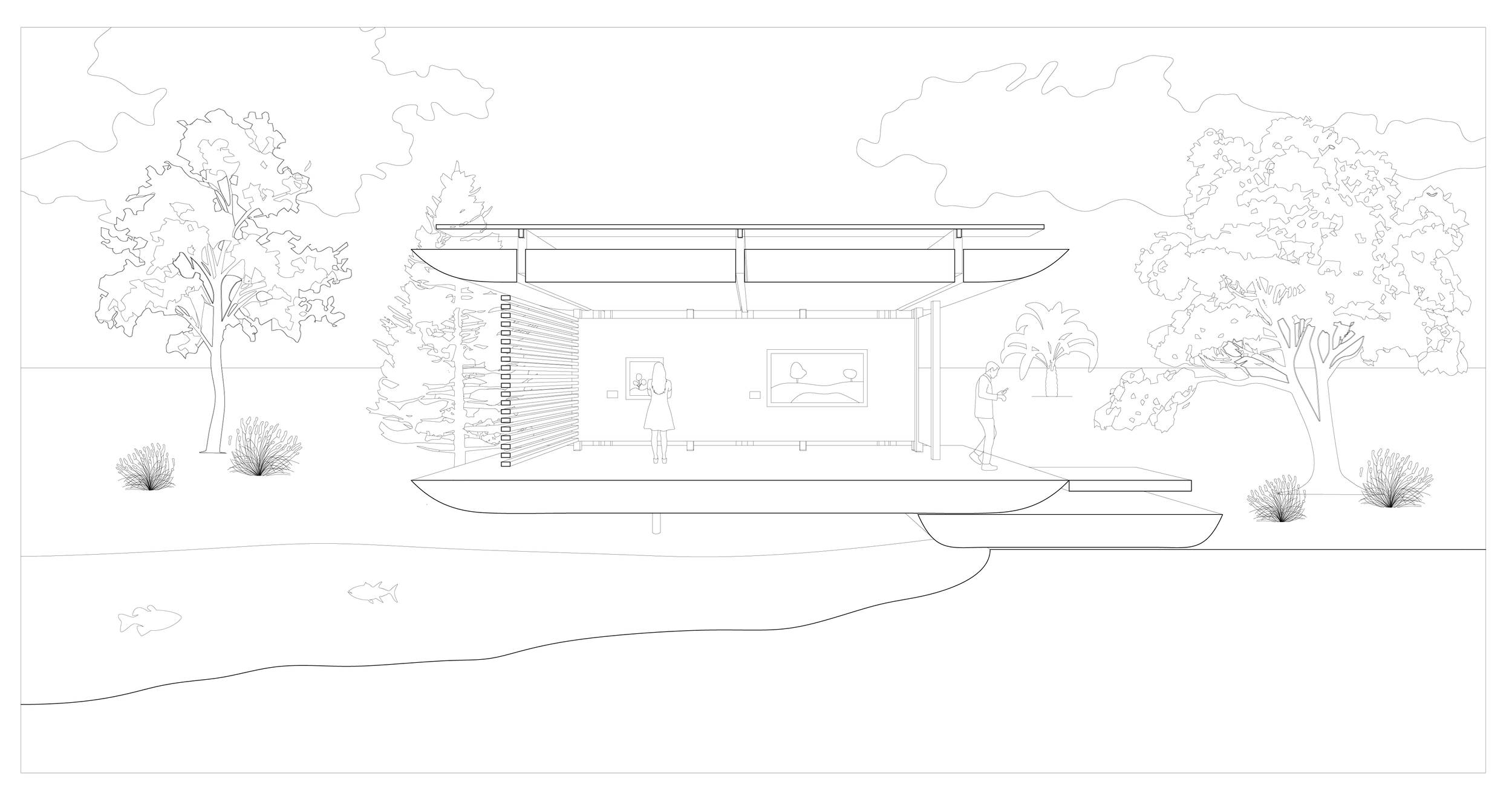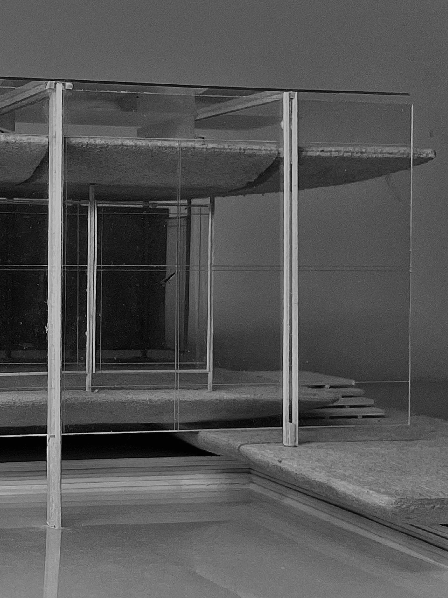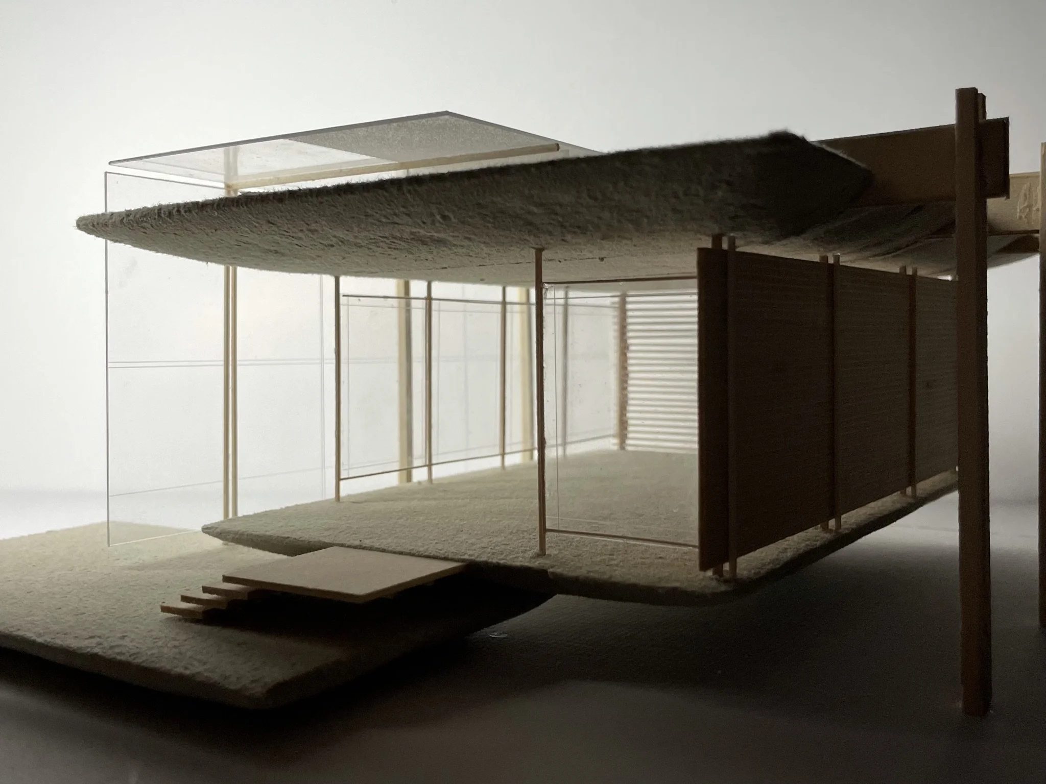 This architectural intervention delicately inhabits a Japanese-inspired garden. It explores the semasiology of the corner through the intersection of materials and spatial directionality. The model captures a sectional interpretation of the intervention, emphasizing how corners frame both the curated landscape and the artwork on display.